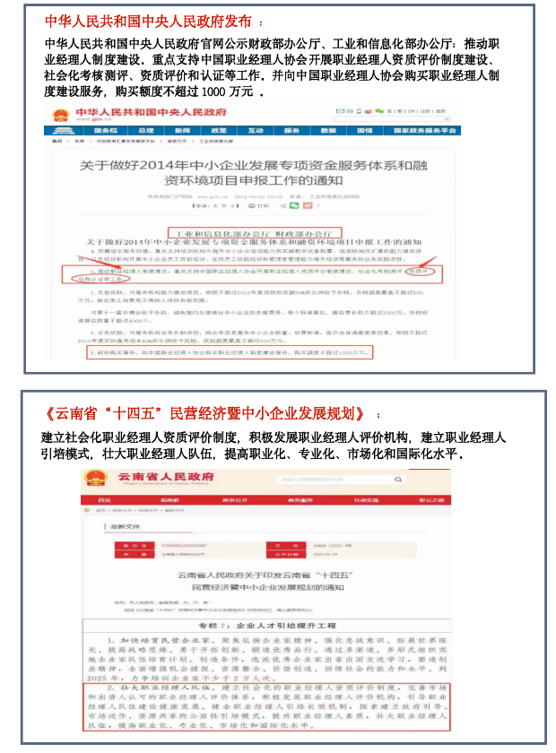 “财税经理人职业资质评价”划分为高级(首席财务官、首席税务官)、中级(财务总监、税务总监)、初级(财务经理、税务经理)三个层级进行培训与评价,是岗位能力、职业能力和专业能力的全方位评价证书,评价方式采用国际国内双认证,通过评价考试的学员由中国职业经理人协会颁发初级、中级、高级三个等级的财务、税务职业经理人证书,并根据国资委《关于中央企业加快建设世界一流财务管理体系的指导意见》中提出的:加快建设世界一流财务管理体系的目标,以及《会计行业人才发展规划》 (2021-2025年)提出的:“通过实施国际化高端会计人才培养工程,着力培养符合会计国际交流合作需要的国际化高端会计人才”文件精神。由英国会计师和簿记师公会IAB(The Institute of Accountants and Bookkeepers,简称IAB)为通过财务经理人职业资质评价考试学员颁发国际财务管理师证书,由英国国际专业会计师公会(International Association Of Accounting Professionals,简称IAAP)颁发国际税务管理师证书,增强我国财税人才队伍的国际竞争力和话语权。