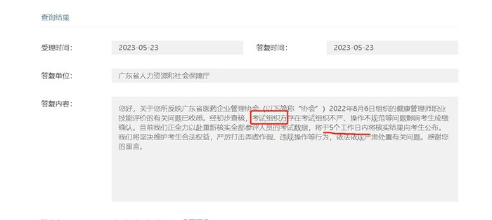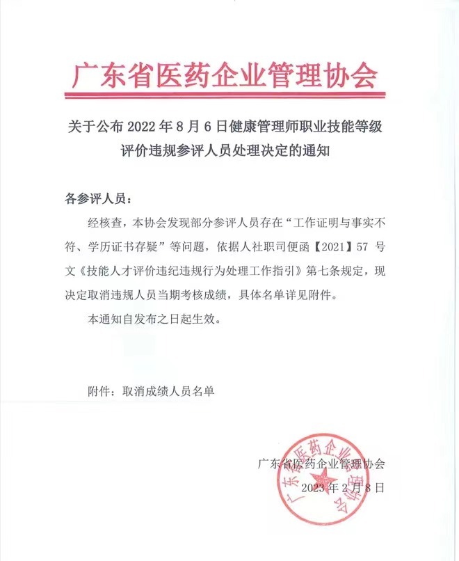 到了5月9日,广东省医药企业管理协会再次发布公告称,2022年9月,广东省技能中心对协会组织2022年8月6日健康管理师(三级)职业等级认定相关资料进行循例抽查复核,发现考生存在学历存疑、工作经历存疑、签名不一致、结业证存疑等问题。2023年3月30日,广东省技能中心对该批次考试相关资料进行复核时,发现仍有考生存在上述问题。协会为了把问题影响面降到最低,同时根据粤人社函【(2021)76号】文件精神,决定对2022年8月6日健康管理师(三级)职业等级认定重新开展考核评价。