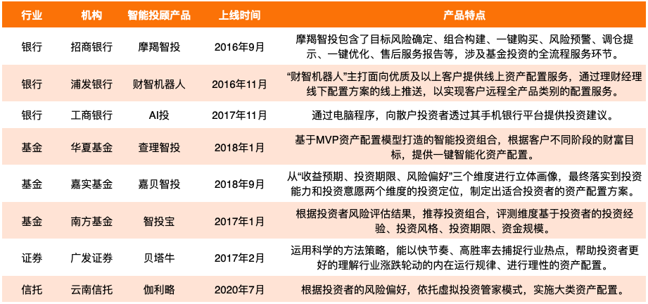 5、智能投顾产品:银行、基金、券商等传统持牌金融机构智能投顾产品丰富   运用人工智能算法,根据风险偏好,财务状况,收益目标等,结合投资组合理论,为客户提供资产配置的建议,而且持续跟踪并动态调整。   智能投顾产品有三类,一是智能投顾服务初创公司,二是互联网公司,三是传统金融机构。前两类公司适用相对简单、标准化的投资产品,满足客户同质化的理财需求;传统金融机构适用“线上+线下”的智能投顾产品,充分利用网点优势,目前银行、券商、基金、信托都推出了各自的智能投顾产品。   目前较为成熟的智能投顾产品有银行系的摩羯智投、财智机器人、AI投等,基金系的查理智投、嘉贝智投、智投宝。证券系的贝塔牛,信托系的伽利略等。   表6:8款智能投顾产品