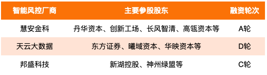 4、智能风控厂商:天云大数据、邦盛科技获得多轮融资   运用大数据和人工智能,可以在线上构建贯穿反欺诈与客户识别认证、授权审批和定价分析、贷后管理与逾期催收的全流程风控模式,除大数据外,智能风控的还包括机器学习算法构建模型等。   目前与金融机构建立紧密合作的智能风控厂商有慧安金科、天云大数据、邦盛科技等。   表5:3家智能风控厂商