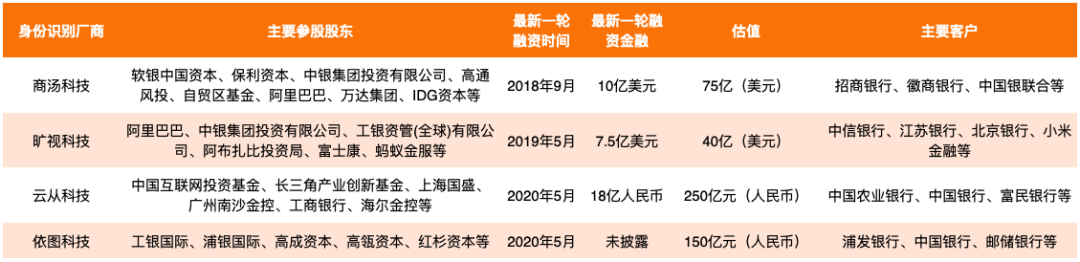 二、10家头部人工智能厂商、8款人工智能金融产品汇总   作为综合的人工智能服务厂商,BAT在金融行业的人工智能产品包括智能营销、智能风控、智能语音、智能识别等,应用场景覆盖几乎所有金融场景。   在身份识别、智能营销等细分场景又有哪些人工智能厂商和人工智能金融产品呢?   零壹财经对商汤科技、旷视科技、云从科技、依图科技、巨量引擎、TalkingData、索信达、科大讯飞等10家头部人工智能厂商以及摩羯智投、AI投等8款人工智能金融产品进行了整理分析,供业界参考。   1、身份识别厂商:AI识别“四小龙“获知名投资机构多轮融资   智能身份识别(即生物识别技术)目前主要使用指纹和人脸识别技术,已经大规模使用。其他生物特征还包括DNA,掌纹,虹膜,视网膜,气味,键盘敲击,步态,声音……   身份识别从三个角度赋能金融:反金融欺诈、拓展服务半径优化服务体验、增加线下场景数据维度。   云从、依图、旷视、商汤,并称为AI识别领域的“四小龙”。   在人工智能的技术应用中,身份识别是中国AI市场的最大组成部分,也是最具商业化价值的赛道,四家公司分别获得了众多知名投资机构的多轮投资。   商汤科技经过8轮融资,目前估值为75亿美元,主要股东包括软银、保利资本、中银等。旷视估值40亿美元,阿里巴巴、中银、工银资管等。云从科技目前估值250亿人民币,主要股东包括中国互联网投资基金、长三角产业创新基金等。依图科技目前估值为150亿人民币,主要股东包括工银国际、浦银国际、高成资本、高瓴资本等。   表2:4家智能身份识别厂商