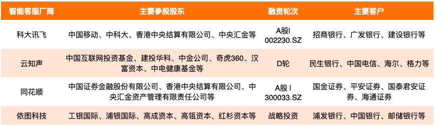 3、智能客服厂商:科大讯飞、同花顺A股上市,云知声、依图分别获得多轮融资   智能客服的本质是客服,在多渠道采用语义理解、语音识别和语音合成等人工智能技术来替代人工客服进行与客户的服务交互。智能客服具有多渠道、智能性和标准化的特性。对于金融行业而言,智能客服赋能传统客服使用户及时得到满意的答复,提升自身服务质量和用户的满意度,更可以减少人工服务,降低企业的运营成本,同时还能收集和分析问题,为智能营销提供相应的大数据分析。   目前服务金融行业的头部智能客服厂商有,科大讯飞、云知声、同花顺、依图科技等,其中科大讯飞、同花顺为A股上市企业,云知声、依图可以分别获得D轮及战略投资。   表4:4家智能客服厂商