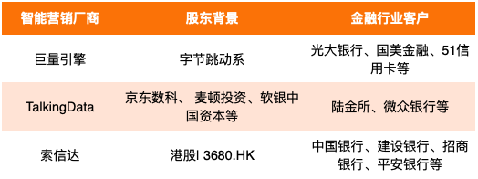 2、智能营销厂商:字节系、软银系纷纷入局   智能营销主要通过人工智能等新技术的使用,对于收集的客户交易、消费、网络浏览等行为数据利用深度学习相关算法进行模型构建,帮助金融机构与渠道、人员、产品、客户等环节相联通,从而可以覆盖更多的用户群体,为消费者提供千人千面、个性化与精准化的营销服务。   目前服务金融行业的头部智能营销厂商有:字节跳动所属的巨量引擎、软银投资的TalkingData、港股上市企业索信达等。   巨量引擎主要服务的金融客户有光大银行、国美金融、51信用卡等。TalkingData金融客户有陆金所、微众银行等。索信达为港股上市公司,金融客户有中国银行、建设银行、招商银行等。