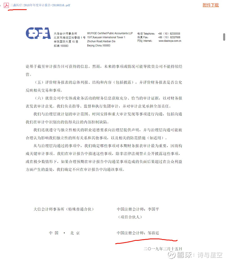 然而,2019年3月15日在三鑫医疗的2018年年报审计报告上签字的时候,邹蓓廷先生还在大信。
