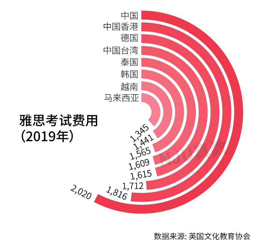 13亿元很多吗?不不不!据英国文化教育协会公布的数据,2019年,全球有350万人考雅思。不过,就像麦当劳在不同国家卖不同价一样,雅思在不同国家的考试收费也各不相同。但令人大跌眼镜的是,中国的雅思考试竟然是最贵的!