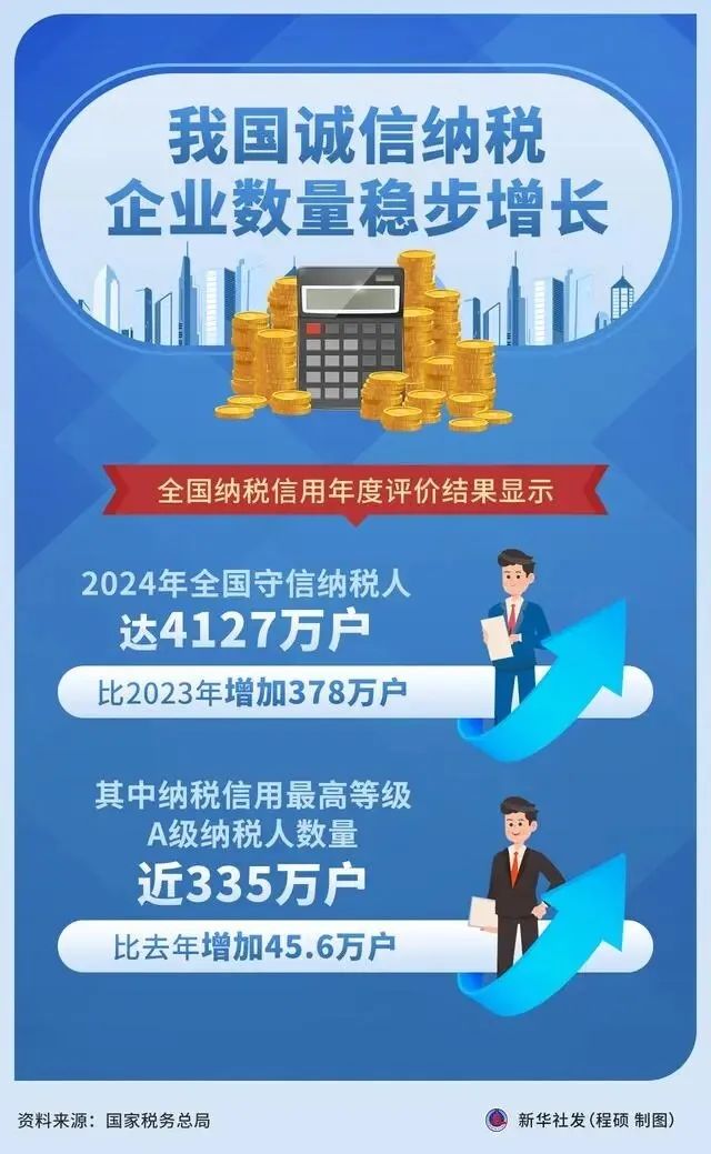 全国纳税信用年度评价结果显示,2024年全国守信纳税人达4127万户,比2023年增加378万户,其中纳税信用最高等级A级纳税人数量近335万户,比2023年增加45.6万户,诚信纳税企业数量稳步增长。
