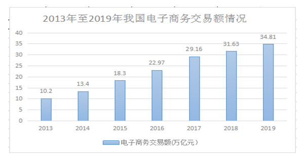 近年来,随着互联网的不断发展,不断涌现出“618年中大促”、“双十一”、“年货节”等电商促销活动。同时,移动支付的便利,也为互联网经营带来了巨大的机遇。2013年至2019年我国电子商务交易额稳步增长,2019年达到34.81万亿元。