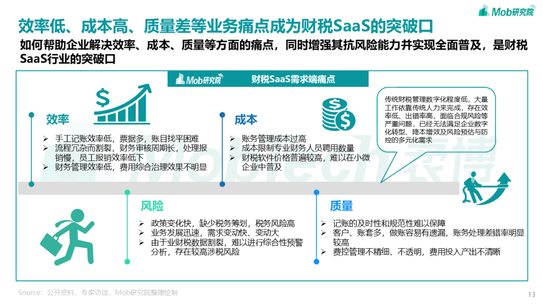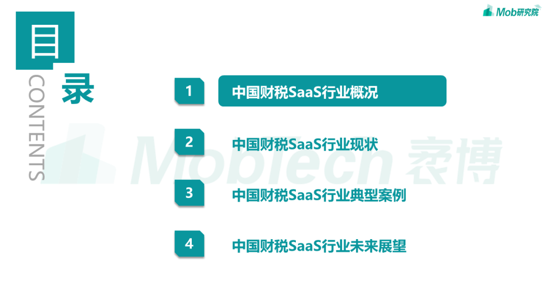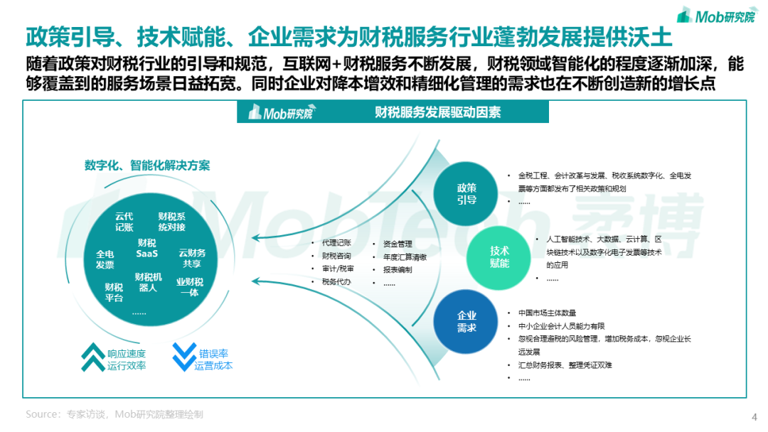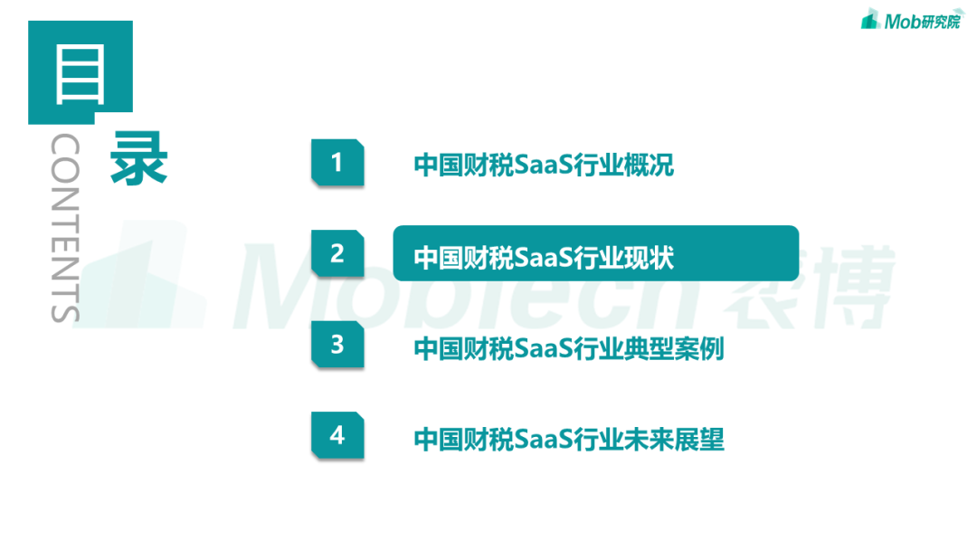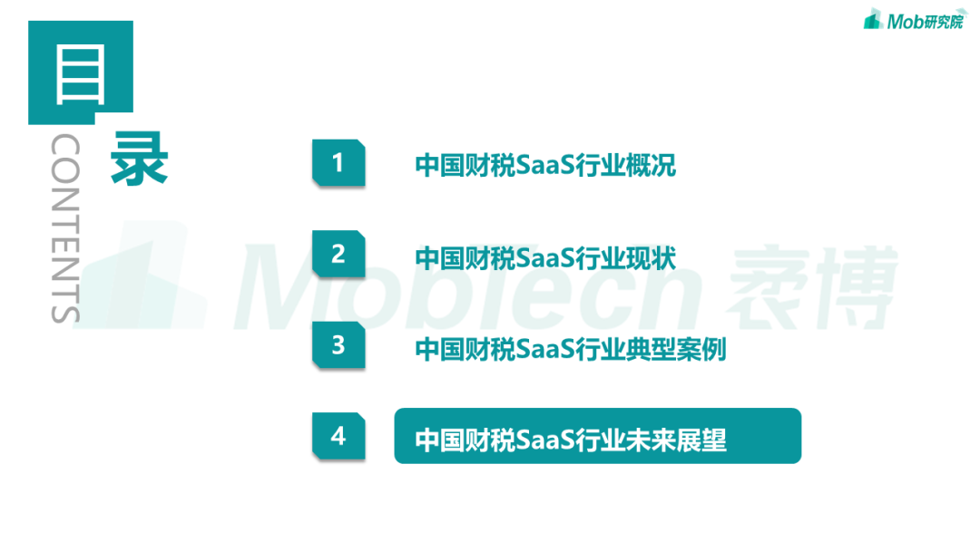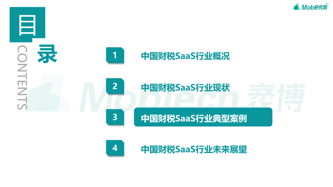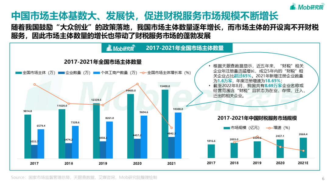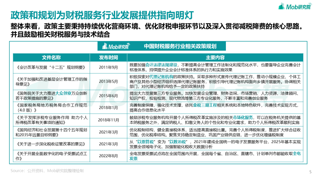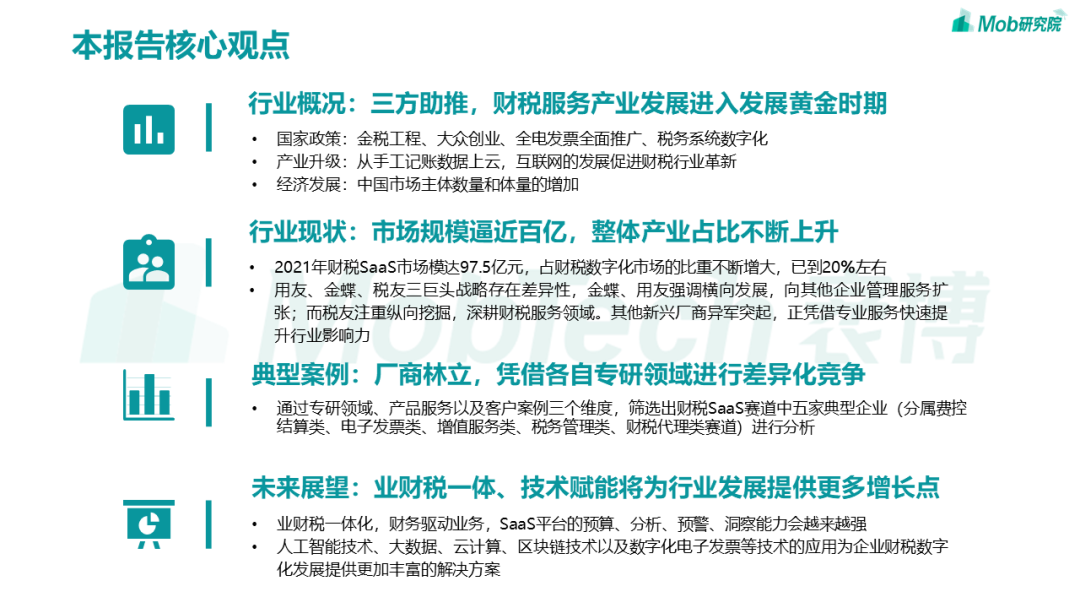 Mob研究院分析师观点: 行业概况:三方助推,财税服务产业发展进入发展黄金时期 • 国家政策:金税工程、大众创业、全电发票全面推广、税务系统数字化 • 产业升级:从手工记账数据上云,互联网的发展促进财税行业革新 • 经济发展:中国市场主体数量和体量的增加 行业现状:市场规模逼近百亿,整体产业占比不断上升 • 2021年财税SaaS市场模达97.5亿元,占财税数字化市场的比重不断增大,已到20%左右 • 用友、金蝶、税友三巨头战略存在差异性,金蝶、用友强调横向发展,向其他企业管理服务扩张;而税友注重纵向挖掘,深耕财税服务领域。其他新兴厂商异军突起,正凭借专业服务快速提升行业影响力 典型案例:厂商林立,凭借各自专研领域进行差异化竞争 • 通过专研领域、产品服务以及客户案例三个维度,筛选出财税SaaS赛道中五家典型企业(分属费控结算类、电子发票类、增值服务类、税务管理类、财税代理类赛道)进行分析 未来展望:业财税一体、技术赋能将为行业发展提供更多增长点 • 业财税一体化,财务驱动业务,SaaS平台的预算、分析、预警、洞察能力会越来越强  • 人工智能技术、大数据、云计算、区块链技术以及数字化电子发票等技术的应用为企业财税数字化发展提供更加丰富的解决方案