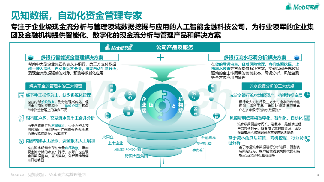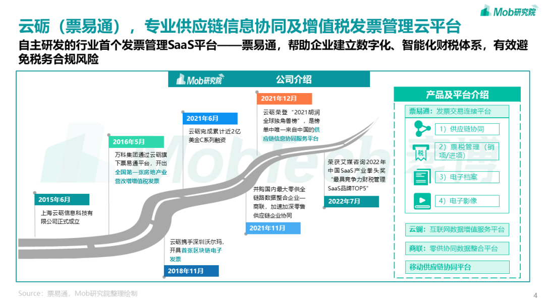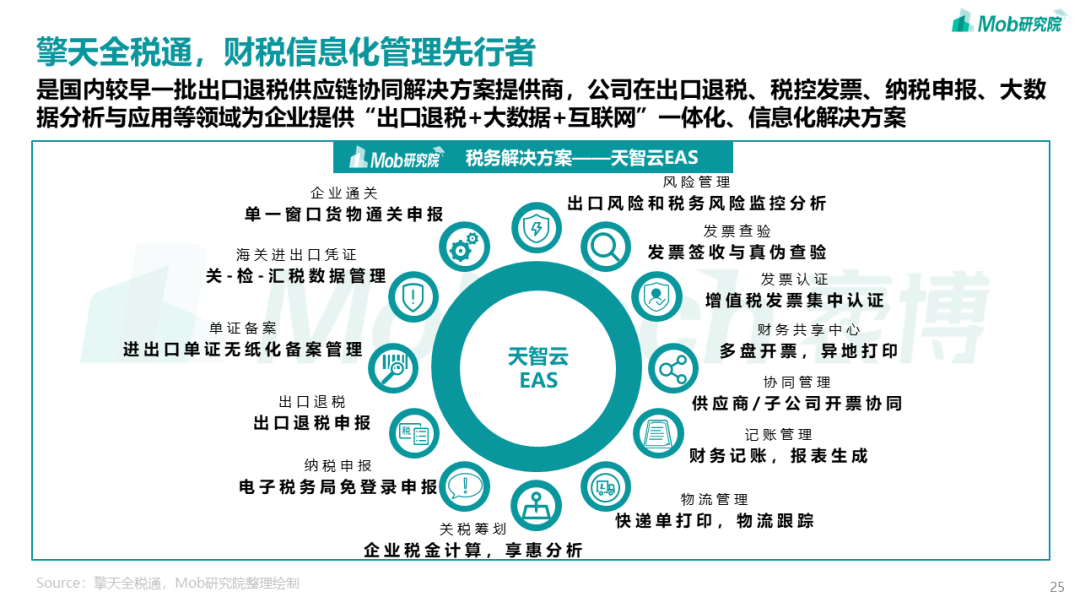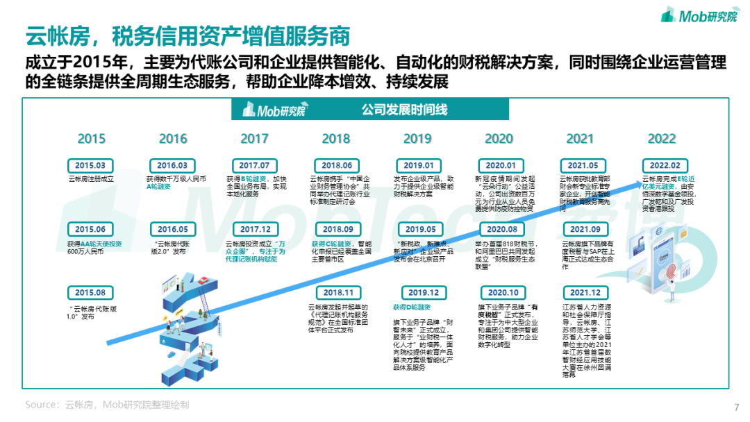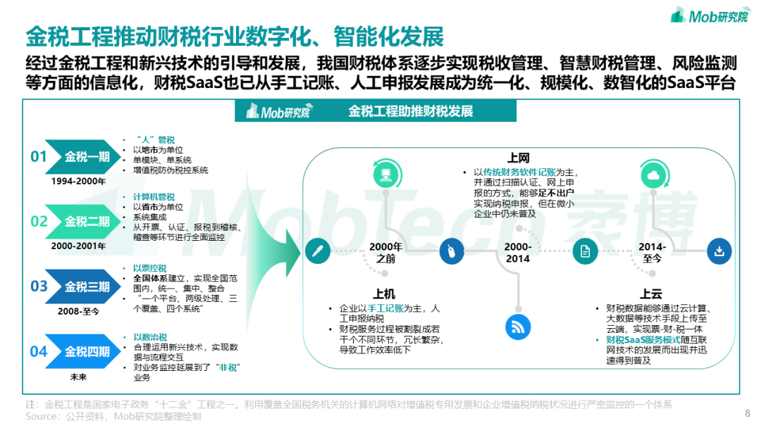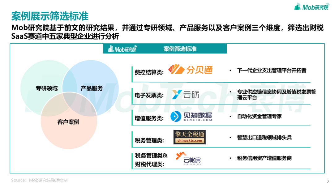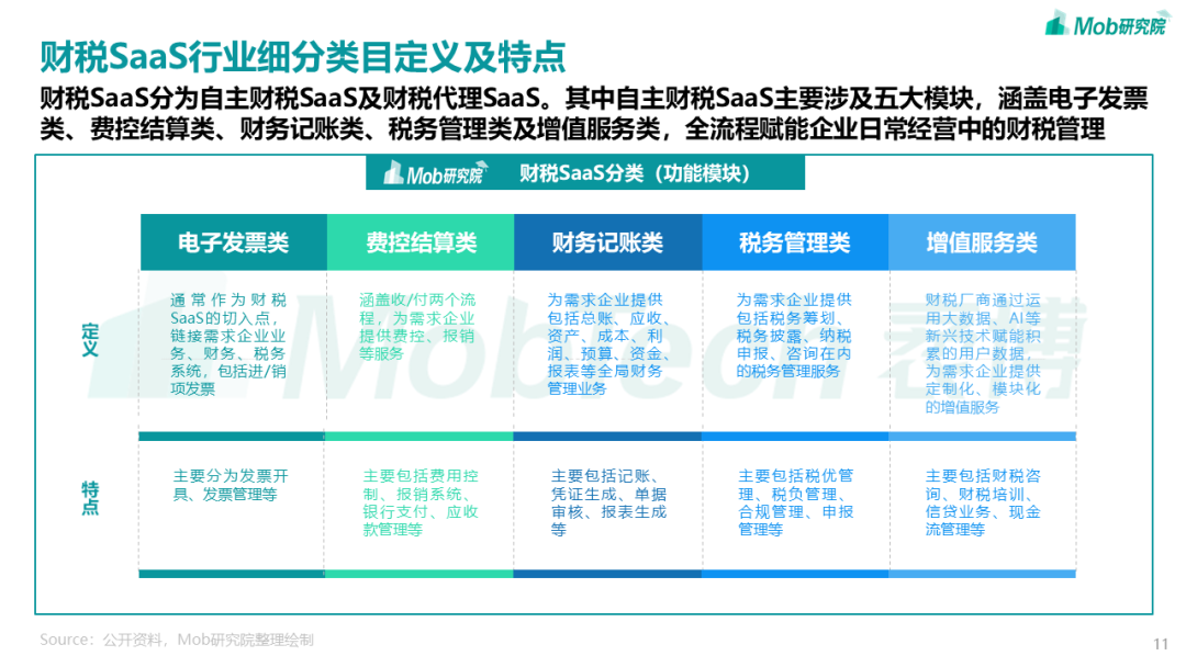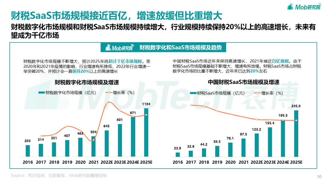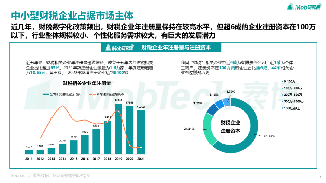 Mob研究院分析师观点: 行业概况:三方助推,财税服务产业发展进入发展黄金时期 • 国家政策:金税工程、大众创业、全电发票全面推广、税务系统数字化 • 产业升级:从手工记账数据上云,互联网的发展促进财税行业革新 • 经济发展:中国市场主体数量和体量的增加 行业现状:市场规模逼近百亿,整体产业占比不断上升 • 2021年财税SaaS市场模达97.5亿元,占财税数字化市场的比重不断增大,已到20%左右 • 用友、金蝶、税友三巨头战略存在差异性,金蝶、用友强调横向发展,向其他企业管理服务扩张;而税友注重纵向挖掘,深耕财税服务领域。其他新兴厂商异军突起,正凭借专业服务快速提升行业影响力 典型案例:厂商林立,凭借各自专研领域进行差异化竞争 • 通过专研领域、产品服务以及客户案例三个维度,筛选出财税SaaS赛道中五家典型企业(分属费控结算类、电子发票类、增值服务类、税务管理类、财税代理类赛道)进行分析 未来展望:业财税一体、技术赋能将为行业发展提供更多增长点 • 业财税一体化,财务驱动业务,SaaS平台的预算、分析、预警、洞察能力会越来越强  • 人工智能技术、大数据、云计算、区块链技术以及数字化电子发票等技术的应用为企业财税数字化发展提供更加丰富的解决方案