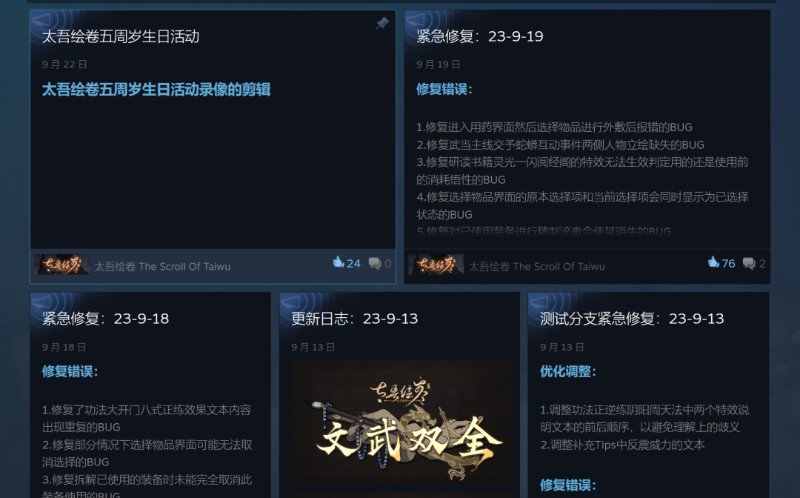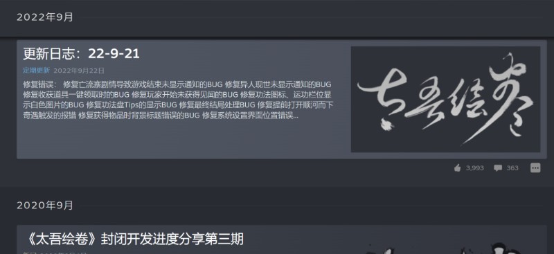 然而两年潜心闭关研发并没能收获更多的理解。2022年9月21日,《太吾绘卷》上线了重制的“新版”,却因为层出不穷的BUG和近乎于无的教程引导,使得口碑急转直下,褒贬不一。加上一时闹得沸沸扬扬的程序员跑路事件,最终《太吾绘卷》从神坛跌落。