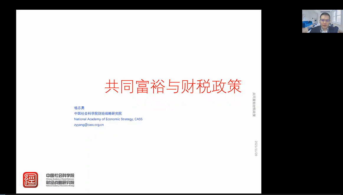 2021年11月28日下午,中国社会科学院财经战略研究院副院长、中国社会科学院财政税收研究中心主任、中国社会科学院大学杨志勇教授应方红生副院长之邀,通过腾讯会议在“浙大经院财税大讲堂”上作了第43期讲座,主题为“共同富裕与财税政策”。浙江省财政厅陈优芳主任,浙江大学经济学院财政学系周夏飞副教授、康笛副教授、李培百人计划研究员、樊骥暕老师以及部分硕博研究生、本科生等近90人参加了讲座。