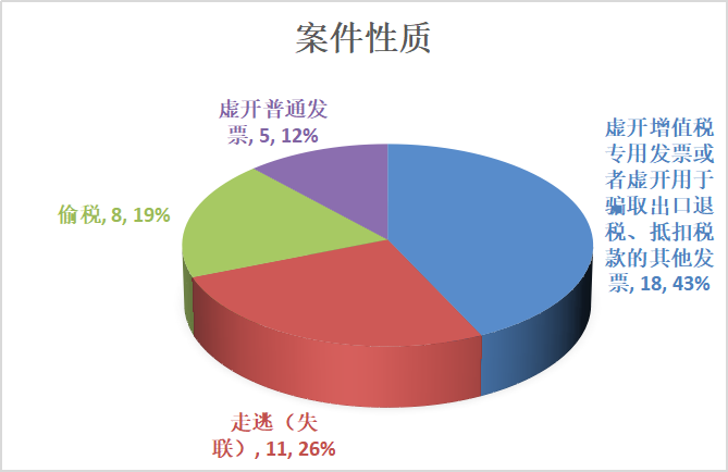上述案件中,以虚开增值税专用发票数量最多,高达18件。企业走逃(失联)位居第二,为11件;偷税类案件数量第三,共8件;虚开普通发票案件数量第四,共5件。