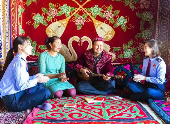 “各族人民同心奔小康,我们的日子越过越红火……”近日,在新疆昌吉回族自治州呼图壁县石梯子乡多斯特克村,哈萨克族牧民叶尔包拉提·沙兰与他的家人和税务“亲戚”围坐炕头,弹着动听的冬不拉,用阿肯弹唱的方式,唱出减税好政策,歌唱幸福美好的生活。
