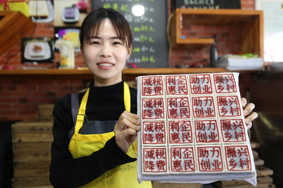 还没待黄徐洁回答,大糕就端了上来。梁弄大糕是余姚的传统糕点,外形美观、香甜柔糯。其外形方正,上面一般用可食用的红粉印上吉祥字样,红白分明,色彩鲜艳。与以往不同的是,黄徐洁送给客人品尝的大糕上,印的不是惯常的“福禄寿喜”,而是令人耳目一新的16个字:减税降费,惠民利企,助力创业,振兴乡村。黄徐洁笑着跟客人道出这16个字背后的故事。“开春时税务干部来过,他们说今年起,我的小店如果月销售额不超过10万元,就不用缴增值税了。国家减了税,这便宜我可不能一个人占着,所以让你们也尝尝实惠。”话音刚落,客人们纷纷称赞“老板娘阔气”。
