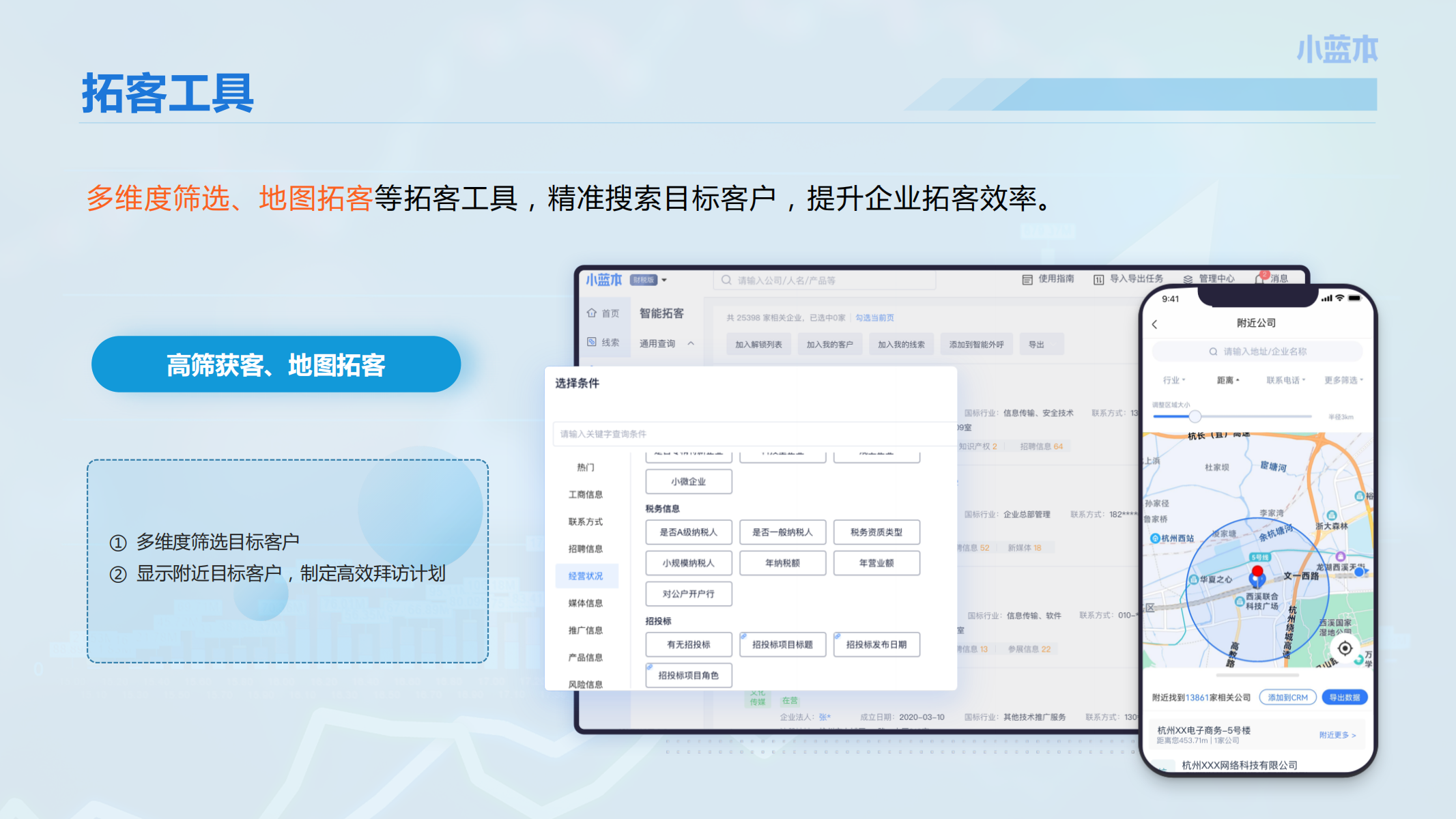 现在有很多基于AI+大数据,结合财税服务业务场景提供多重筛选纬度的大数据获客系统。小蓝本获客系统是一款专为财税服务行业设计的大数据获客工具,它利用AI+大数据技术帮助企业实现数字化营销转型。这个系统提供了超过10000个数据维度的选择,允许用户根据具体需求组合使用不同的筛选条件,从而获取海量的潜在客户线索。这意味着无论是寻找特定地区的小微企业还是全国范围内的大型企业集团,都能够快速定位到最合适的对象。这样销售团队可以直接接触到财税行业的目标群体,从而减少无效沟通的时间,集中资源于高价值的对话上。