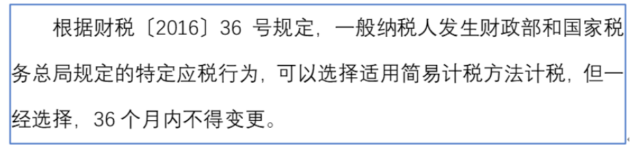答:根据财税〔2016〕36号规定,一般纳税人发生财政部和国家税务总局规定的特定应税行为,可以选择适用简易计税方法计税,但一经选择,36个月内不得变更。