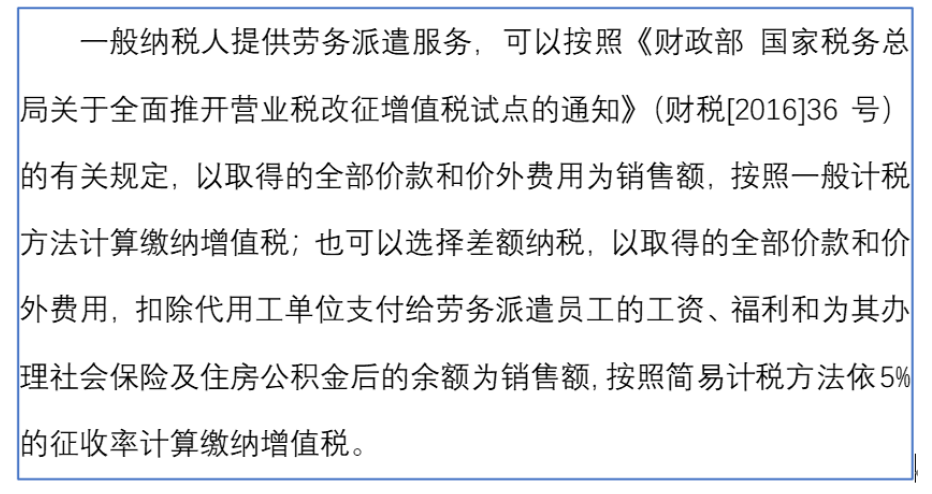 结合以上两个文件,可以得出一个结论:一般纳税人提供劳务派遣服务,可以选择一般计税,适用税率6%,也可以选择简易计税,以取得的全部服务价款减去支付给劳务派遣用工的工资、福利、社保和公积金后的差额,按照5%的征收率计算交纳增值税。而且,一旦选择了简易计税,就必须持续采取简易计税36个月,期间不能变更为一般计税。