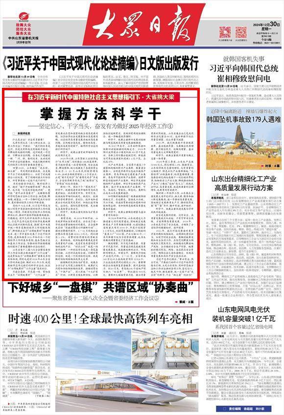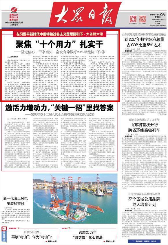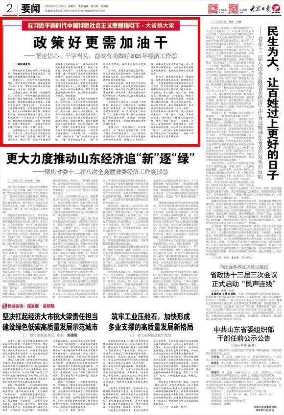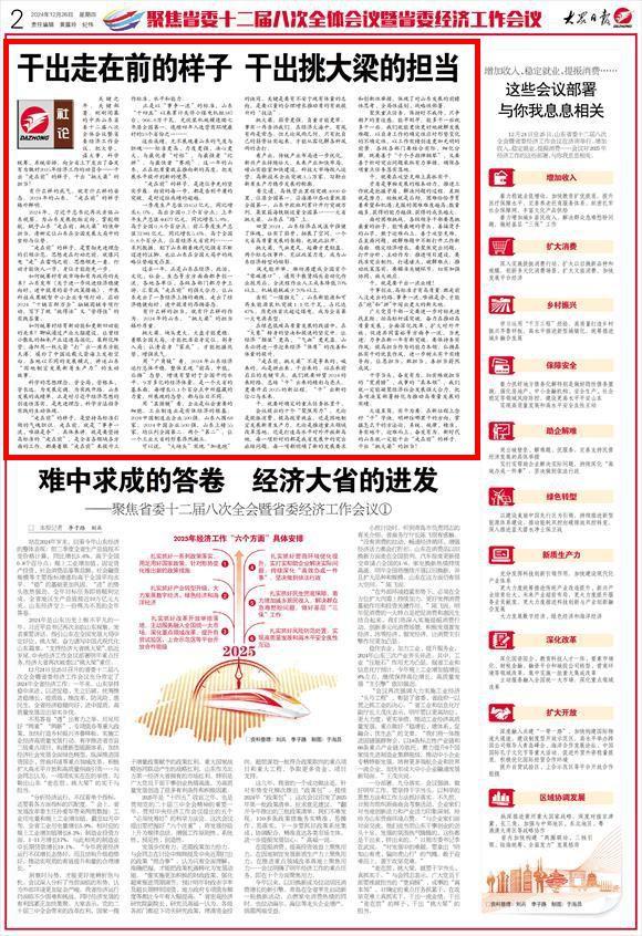 关键之年,关键部署。中共山东省委十二届八次全体会议暨省委经济工作会议,把大势、谋大事,科学统筹、系统安排,向全省上下发出了奋发有为做好2025年经济工作的动员令——干出“走在前”的样子,干出“挑大梁”的担当!