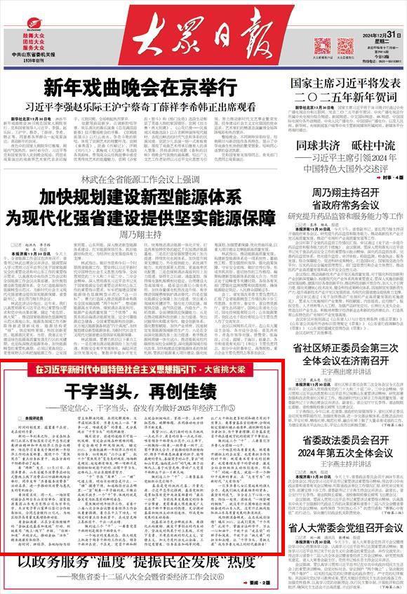 关键之年,关键部署。刚刚闭幕的中共山东省委十二届八次全体会议暨省委经济工作会议,把大势、谋大事,科学统筹、系统安排,向全省上下发出了奋发有为做好2025年经济工作的动员令——干出“走在前”的样子,干出“挑大梁”的担当!