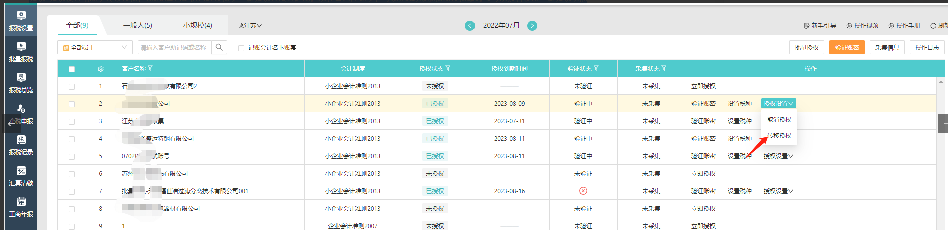 报税-报税设置增加了转移授权,如果A公司之前已经授权了一键报税且没有过期,现在公司注销了,可以把A的报税权限授权给B,B可以接着使用一键报税功能