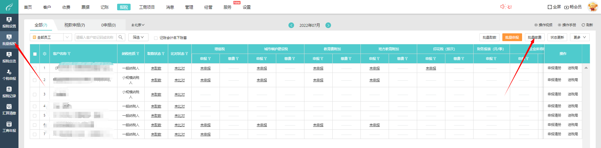 勾选需要申报的客户,点击“批量申报”或点击单个客户操作中的“申报“或直接点击对应税种”未填写或未申报“均可以进入申报流程。