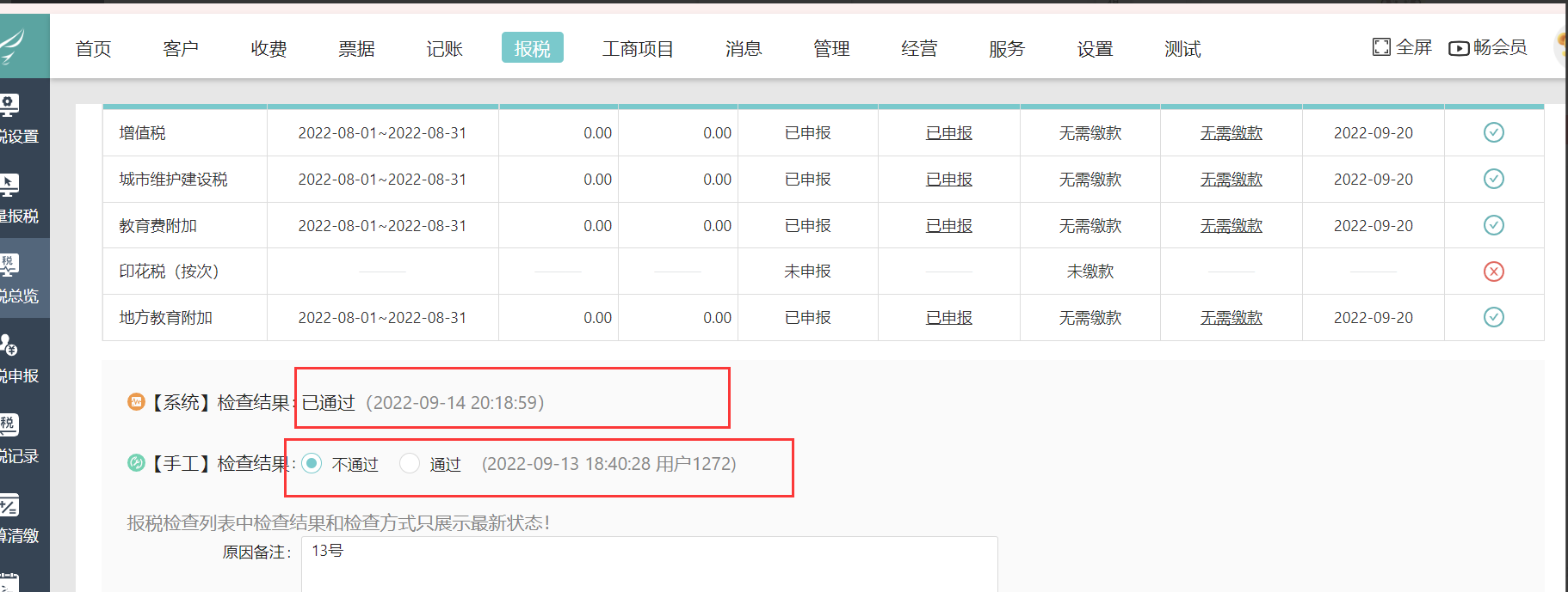 报税检查详情页显示系统和人工的操作结果,最终是否通过以最后一次操作的为准