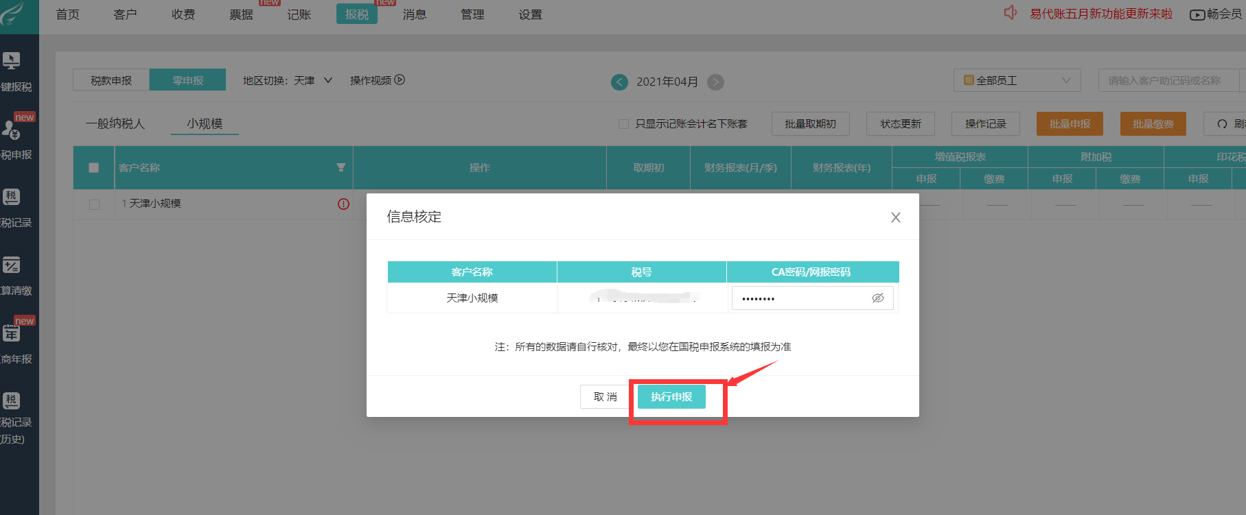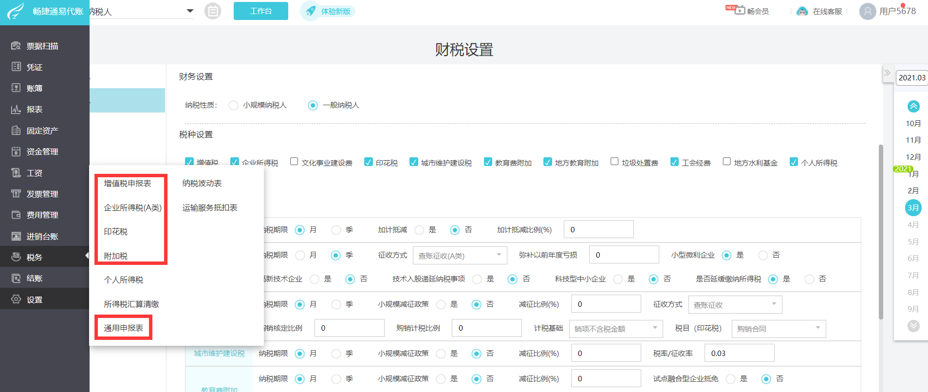 3、计算税表:依据财税设置中设置的信息+税表数据源,计算易代账系统税表;后台自动计算;