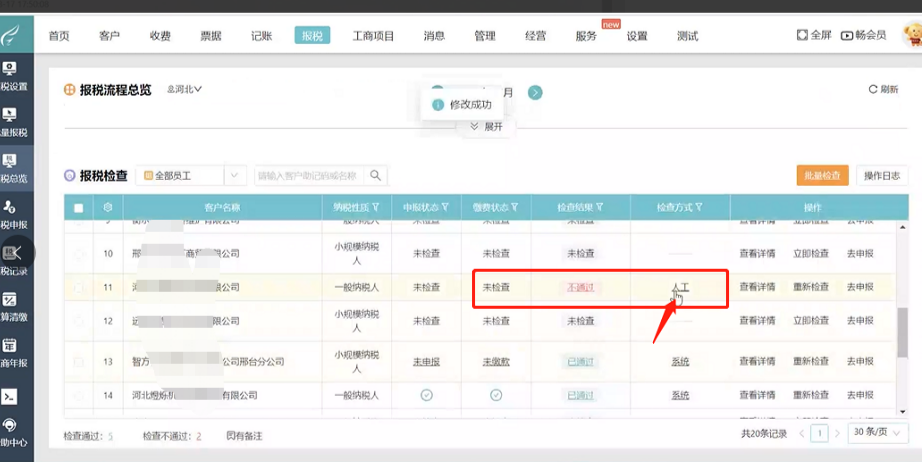 在报税-报税总览-报税检查页面增加了检查失败的提示,可以选择人工检查或者是系统检查