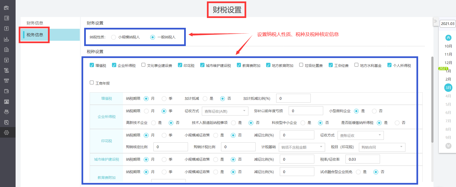 1、财税设置:主要设置纳税人税务信息,包括纳税人类型、核定税种信息、纳税期限、财税政策、计税依据;