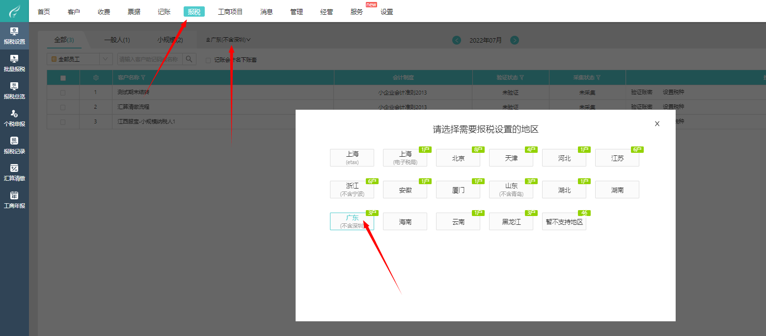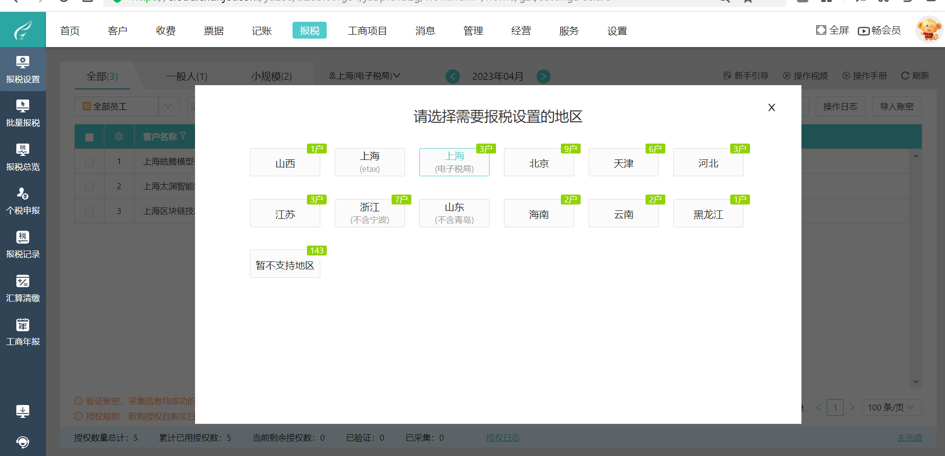 3.在选择申报地区界面,地区右上角会提示当前有多少个账套,可根据地区账套数来定购买多少账套的一键申报数。