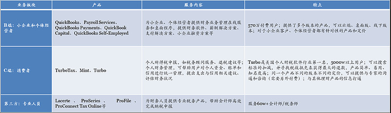 对比美国的代表性财税类SaaS公司Intuit(如,财捷公司),可以看出中美处于不同的发展阶段。Intuit已打造了面向B、C两端的产品矩阵,在B端主要为财务软件,在C端主要为个税软件,覆盖了目标客群全方位的财税需求,在美国市场市占率稳居第一,同时向欧洲国家、澳大利亚等国家进一步市场拓展。