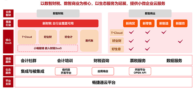 业务特点:基于小微企业数智化的需求,好会计(票财税一体化数智财税SaaS产品)、好生意(面向微型商贸及零售企业的数智商业SaaS产品)、T+Cloud(「人、财、货、客」一体化SaaS产品)、好业财(面向商贸、零售、服务业小型企业的SaaS产品)、易代账(面向代账行业的数智财税SaaS产品)