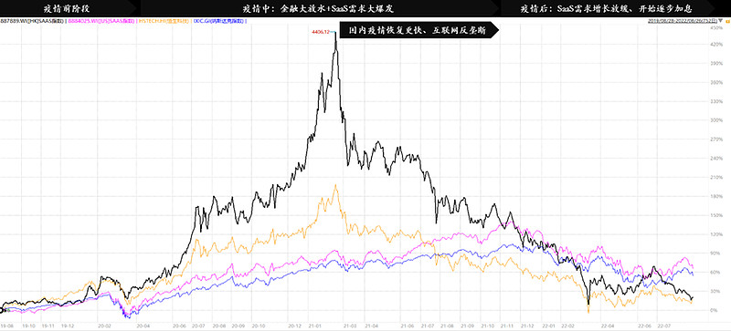 2021年12月后,由于美国金融开始收紧,再加上美国通胀的持续提升,导致市场偏好收敛;更为重要的是,海外疫情回归正常,公司业绩同比增速下降。在这两者的共同作用下,美国的SaaS指数和纳斯达克指数也是持续下跌。