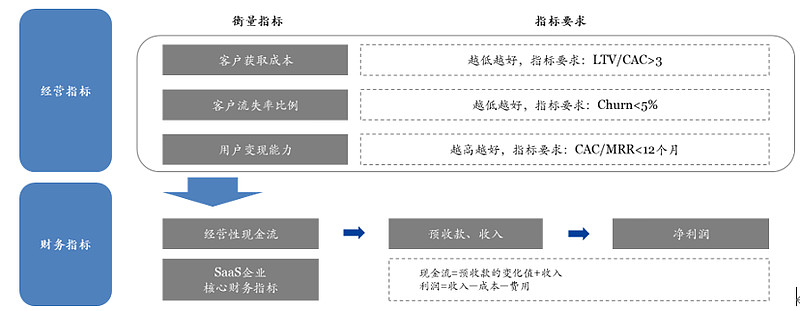 从指标维度,我们要重点关注SaaS公司的3大业务指标、3大财务指标。SaaS企业三大核心经营指标包括:客户获取成本、客户留存比率、用户变现能力。SaaS公司三大核心财务指标包括:现金流指标、收入指标、利润指标。