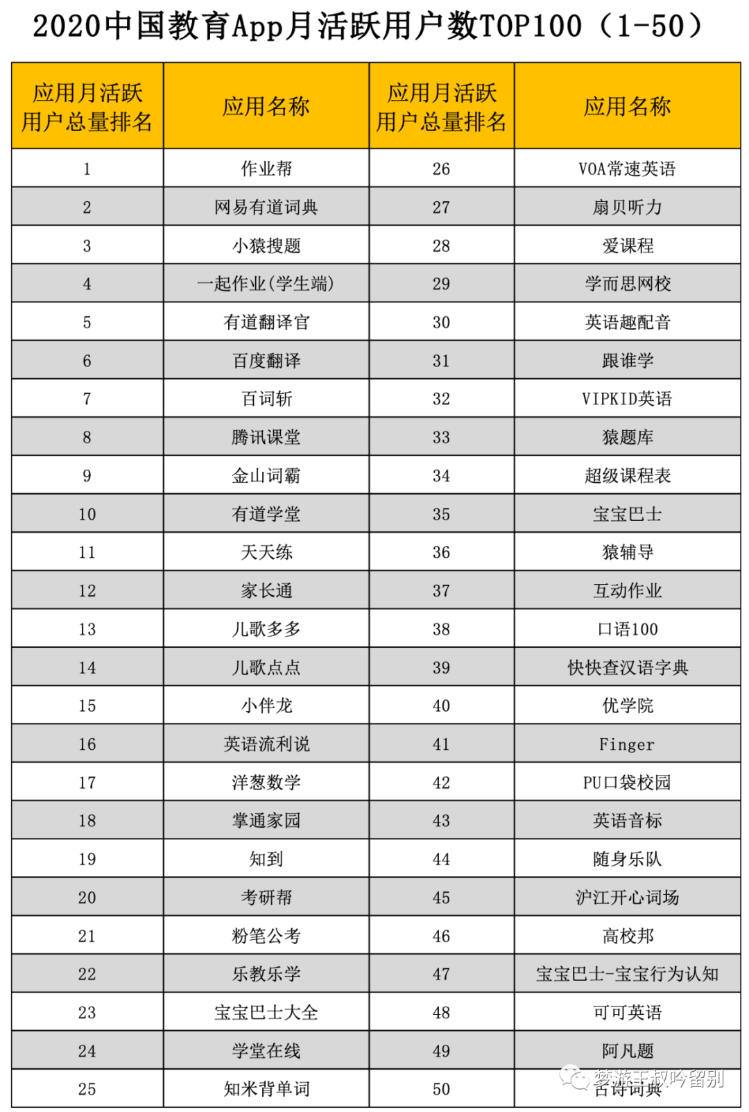 Talkingdata发布的2020中国教育培训移动应用发展研究报告显示,排名前50的应用中,K12是应用数量最多的细分领域,其次是教育工具。整个榜单中看不到与家庭教育相关的应用。