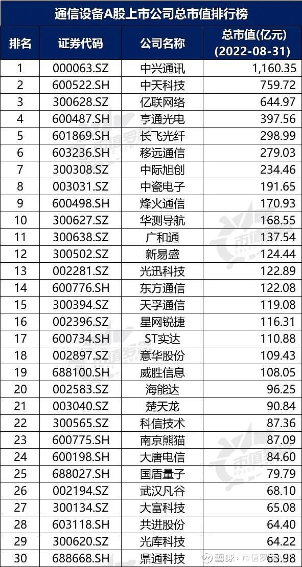 2022年8月31日,通信设备行业A股上市公司总市值8082亿元。20~50亿区间的上市公司31家,占比(38%)最多;50~100亿区间的上市公司23家,占比(28%)次之;超过1000亿的上市公司1家。