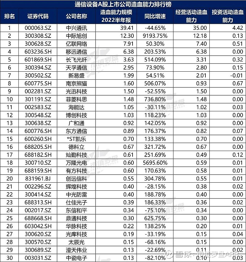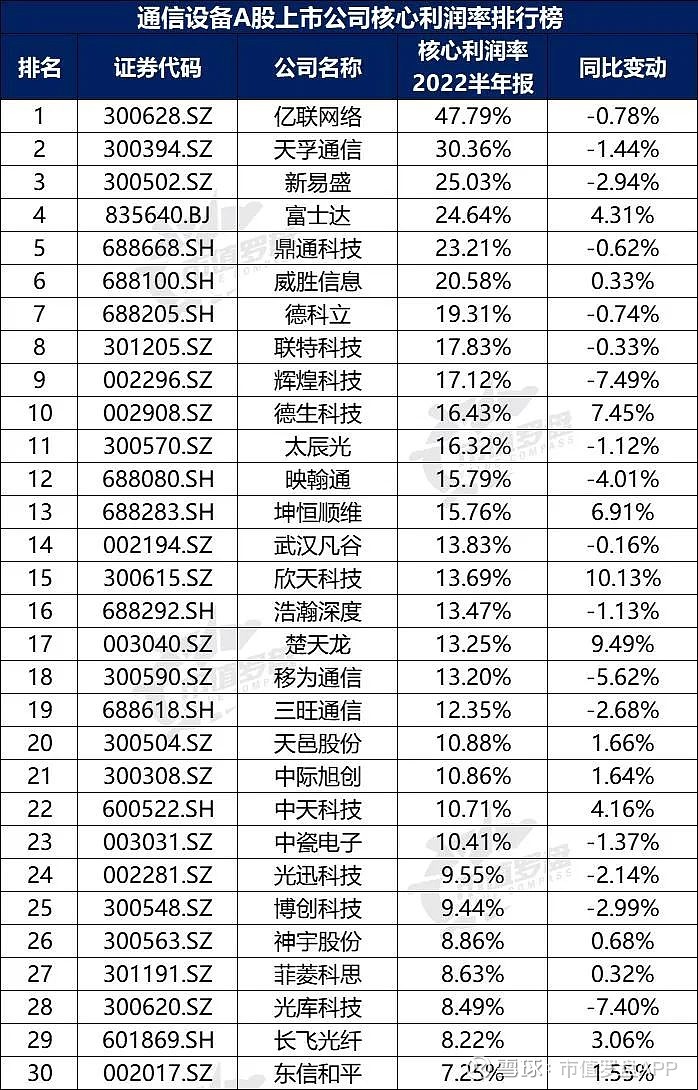 2022上半年通信设备行业A股上市公司33家核心利润增长,14家核心利润出现下滑。