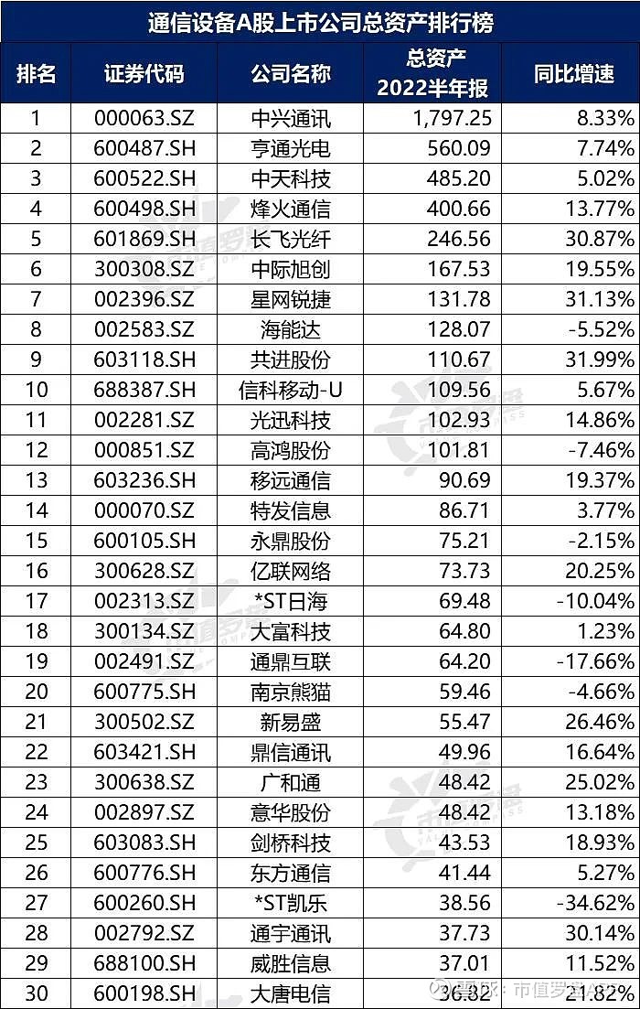其中,1家通信设备行业A股上市公司总资产规模超过1000亿。榜单前三未发生改变,中兴通讯(1797.25亿元)排名第一,亨通光电(560.09亿元)排名第二,中天科技(485.20亿元)排名第三。