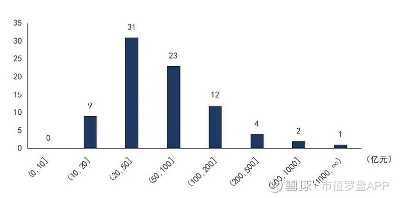 图1:2022年8月31日通信设备行业A股上市公司市值分布(单位:家)