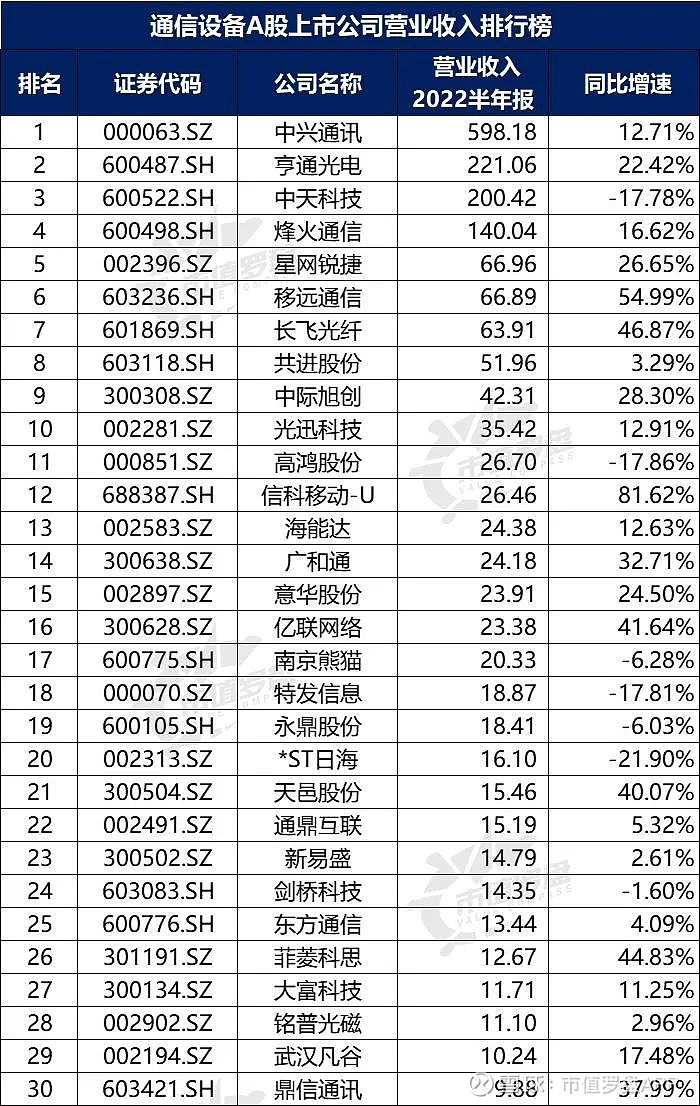 2022上半年通信设备行业A股上市公司榜单前三发生改变,中兴通讯(23.31亿元)保持排名第一,亨通光电(10.86亿元)保持排名第二,中天科技(8.99亿元)代替中际旭创排名第三。