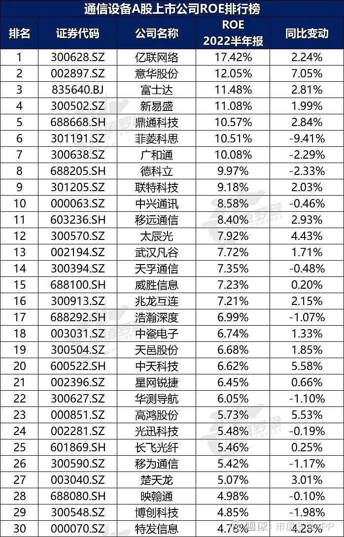 2022上半年通信设备行业A股上市公司中15家公司由于亏损ROE为负数。其中,榜单前三发生改变,亿联网络(17.42%)代替菲菱科思排名第一,意华股份(12.05%)排名第二,富士达(11.48%)代替广和通排名第三。较去年同期,44家公司ROE改善,37家ROE降低。