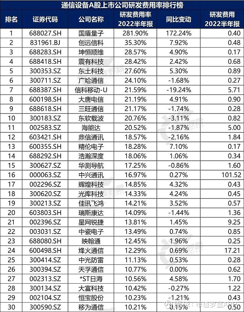 2022上半年通信设备行业A股上市公司研发费用规模前三为中兴通讯(101.52亿元)、烽火通信(17.21亿元)、亨通光电(10.71 亿元)。研发费用率前三为国盾量子(281.90%)、创远信科(35.30%)、坤恒顺维(28.57%)。