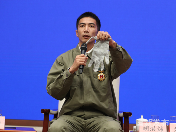 各位记者朋友们,大家好,我叫胡洪炜。2000年退伍以后成为我们国网湖北电力的一名一线工人,也正好赶上我们国家大力发展“电力高速公路”建设,就是通过超高压、特高压输电线路在全国长距离的进行电力资源调配,特高压带电作业一直是世界的禁区,但禁区也得有人去闯,2009年我非常有幸成为世界±800千伏特高压带电作业第一人。这是我们一直使用的手套,它是金属丝和金属粉末混编而成的,这里小个小辫子,它是连接衣服、裤子、袜子,帮它变成一个整体,就好像我们被一个金属笼子保护起来,然后从事带电作业。所以有人称我们是守护电网的特种兵,我就先介绍到这儿。谢谢。