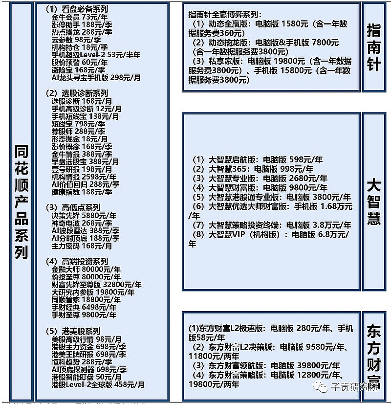 3、提供诸如投顾性质的收费或者什么投资系统。目前五家公司都有在做,其中指南针目前主要以这块业务为主,东方财富、同花顺利用庞大的客户群体优势营收比较靠前,财富趋势在这块目前最弱。