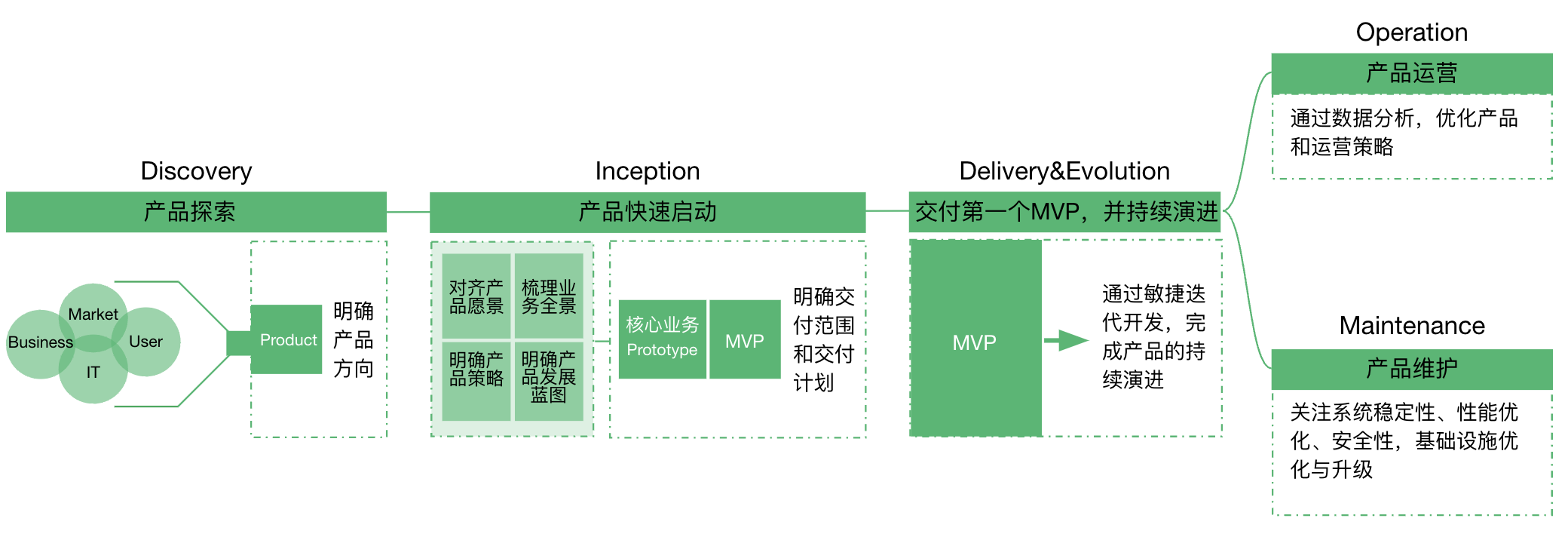 产品交付与演进(Delivery & Evolution)阶段,我们已经明确了产品的方向,并知道如何实施。敏捷交付项目正式启动,这将是一个持续且渐进的过程,伴随着频繁的迭代和交付。通过敏捷开发模式,从第一个MVP(最小可行性产品)开始,产品将在每个迭代中持续交付功能和价值,并不断演进。