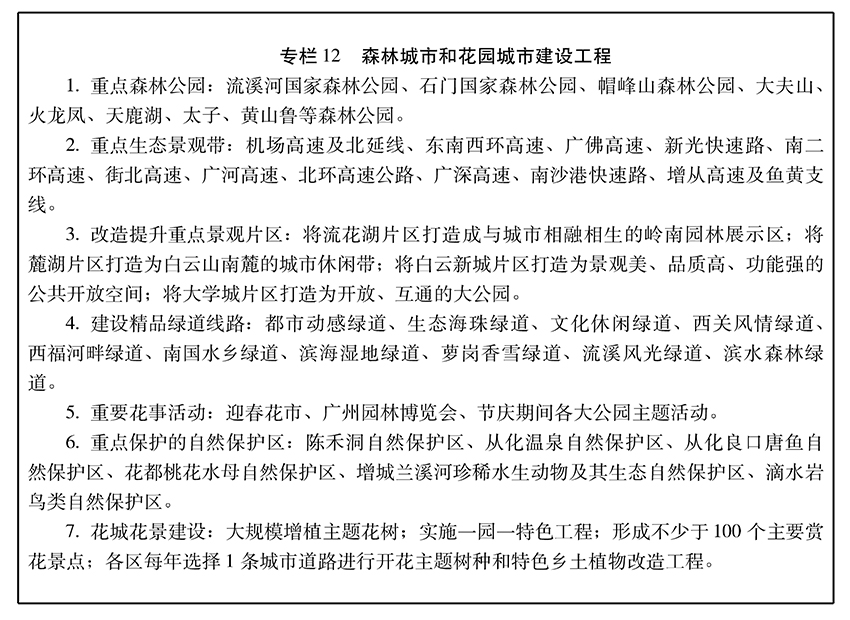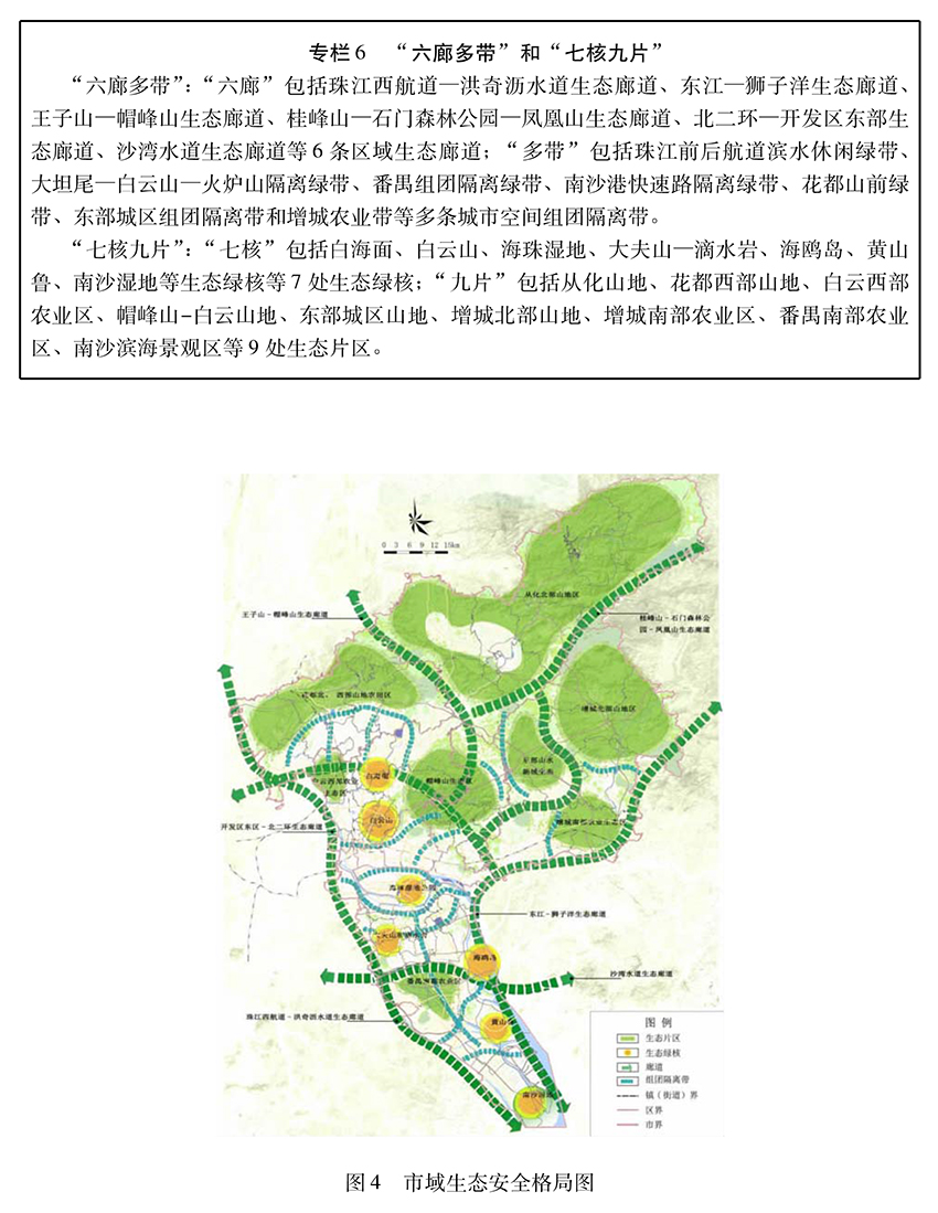 打造生态网络空间体系。充分利用广州市域北部向南部延伸的指状山体绿地和南部向北部指状渗透的河流水系,发挥森林、自然保护区、绿道网、湿地、沿海防护林等生态综合功能,加强生态屏障的建设和城市组团间的生态隔离,围绕各功能组团、功能单元形成“六廊多带”、“七核九片”的总体生态网络结构。