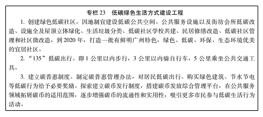 编制绿色低碳社区建设标准,推进节水、节能、节材、节地技术在社区的应用,以绿色设计、环保材料、清洁施工和绿色景观为基础,打造绿色、低碳、环保、生态环境优美的宜居社区。到2020年,建成20个低碳示范社区。将中新广州知识城、广州教育城、珠江新城、广州国际金融城、白云新城、琶洲互联网创新集聚区等重点功能区打造成紧凑集中、功能多元、生态优先的绿色低碳城区。