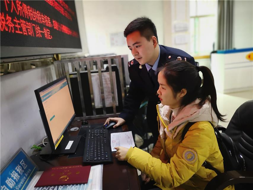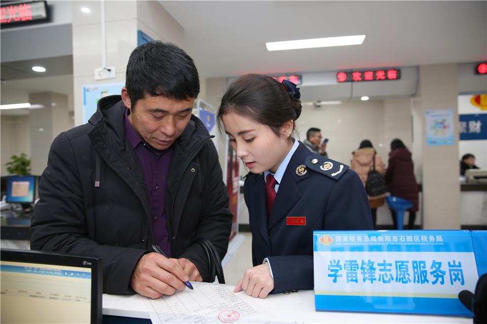 图为国家税务总局衡阳市石鼓区税务局安排雷锋岗指导纳税人办理税收减免业务。