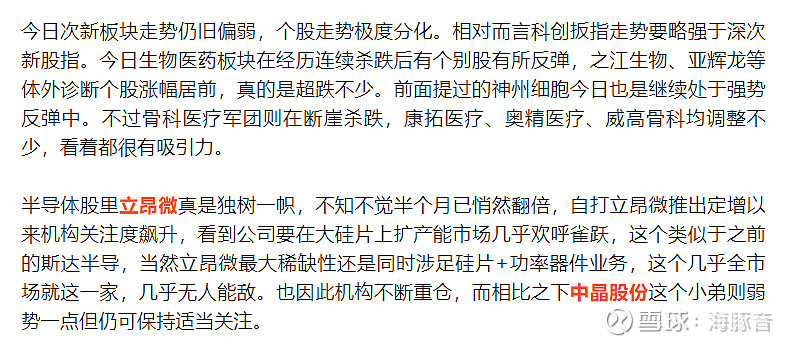 近端次新方面波动可谓巨大,昨日暴涨的读客今日跌超25%,浩通也是已连续大跌三日,还期待和凯立新材有一拼看来还是要谨慎。其他近端次新也大多不断阴跌,没有太多想参与的。总体最近感觉科创质地也略有下滑,那个倍轻松感觉更适合来创业板上市,今天还在炒。