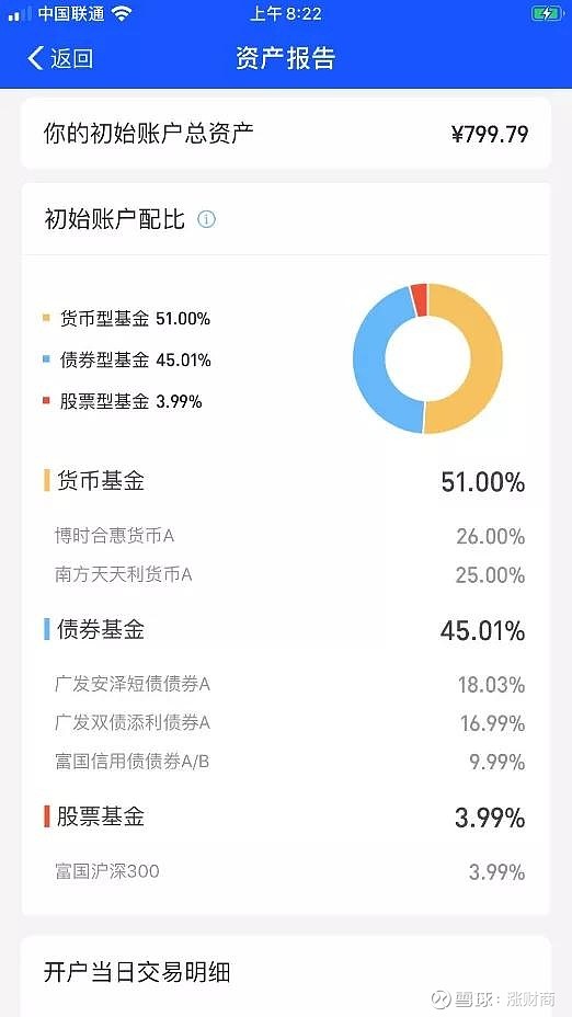 但是,当时只知道这个比例,并不知道投了哪些基金。这份报告则给出了全部的清单(如下),由此,笔者知道了自己的800元是这样投的:货币基金51%(其中包括博时合惠货币A 26%,南方天天利货币A 25%),债券基金45.01%(其中包括广发安泽短债债券A 18.03%,广发双债添利债券A 16.99%,富国信用债债券A/B 9.99%),股票基金3.99%(其中包括富国沪深300 3.99%)。